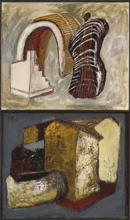 Ging es Katharina Duwe in ihrer Landschaftsmalerei zunächst noch darum, dem ungeheuren Naturerlebnis, der Impression von Licht und Schatten gerecht zu werden, so entfernt sie sich mit ihren Stadtlandschaften, die wenig später entstehen, immer mehr vom gesehenen Vorbild. Sie verdichtet die Malerei auf die ihr wesentlichen Elemente. Form und Farbe gewinnen an Bedeutung. Die Form tritt aus der Fläche in den Raum. Sie baut Volumen auf, wird faßbar - unabhängig vom Gegenstand. Die Farbe zeichnet diesen Weg nach. Sie wird pastos, mit Baustoffen wie Sand und Gips gemischt gewinnt sie an Materialität, bildet Reliefzonen. Der 'Weg nach Innen' hat begonnen. Doch immer noch bleibt die äußere Wirklichkeit ablesbar. Erst das Finden der architektonischen Überreste vergangener Epochen treibt den Formfindungsprozeß stärker voran. Die Künstlerin läßt den Gegenstand als Objekt verschwinden, um ihn als Form zu rechtfertigen. Die Form verselbständigt sich. Sie hat nun lediglich den Charakter von Architekturmodellen. Die Fundstücke eignen sich als Bedeutungsträger. Das Eigenartige rückt in den Mittelpunkt. Katharina Duwes 'Weg nach Innen' führt sie zum Raum. Die Malerei stößt an ihre Grenze.